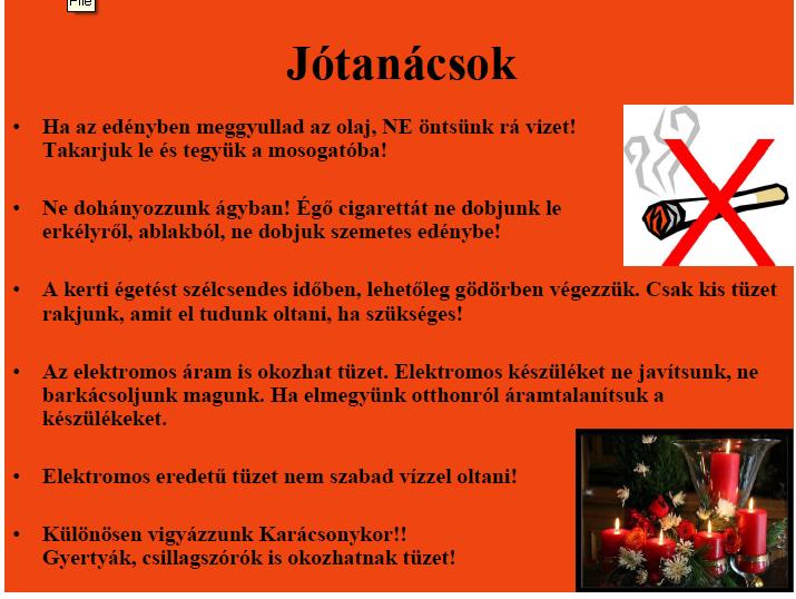 Tűzvédelmi oktatásDA A címekre kattintva megtekinthetjük az adott képhez tartozó részletes leírást, a képekre kattintva diavetítés indul. Tűzvédelmi tanfolyamKDown Tűzvédelmi oktatás.pdf Tűz megelőzése Felkészülés tűzesetre Tűz jelzése Tűzoltókértesítése Tűzoltási feladatok A tűzoltás módja A menekülés módja Égési sérülések JótanácsokKDown Tűzvédelmi oktatás.pdf